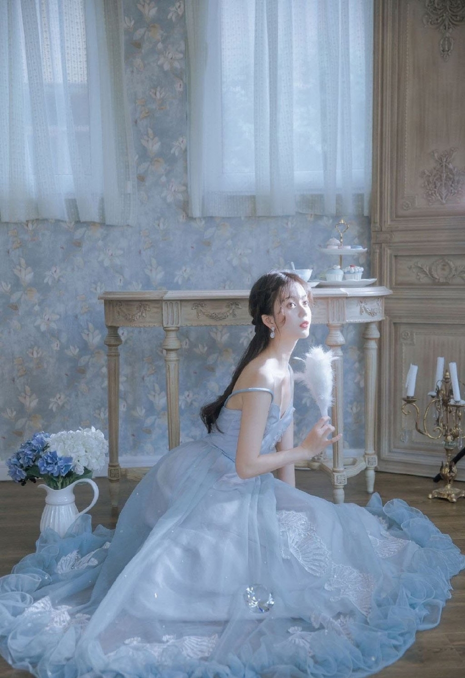 漂亮女人蓝色吊带长裙仙气写真(2)